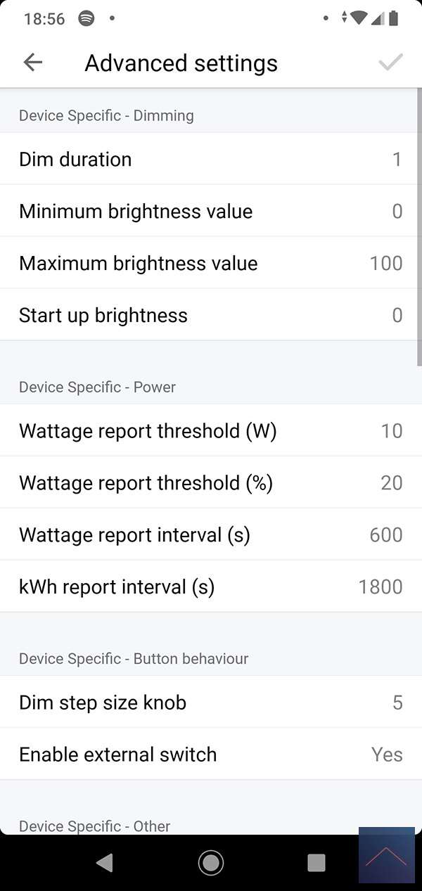 After the installation I see a dimmer, on/off switch, current consumption and total consumption and all configuration options are available. And everything works as it should and reacts quickly.