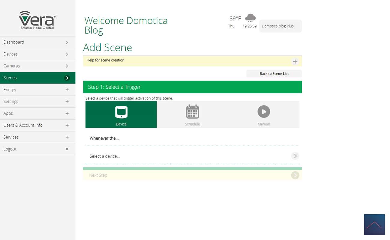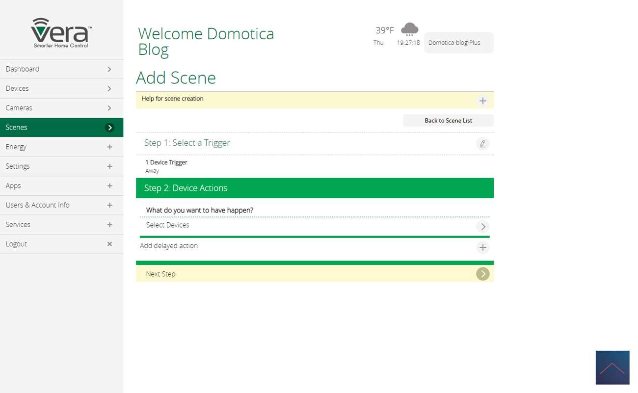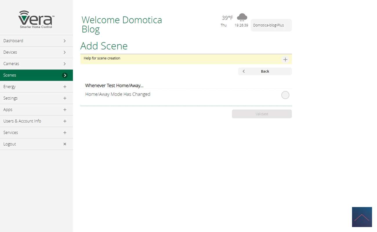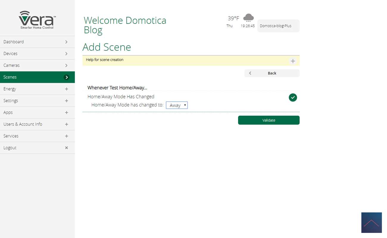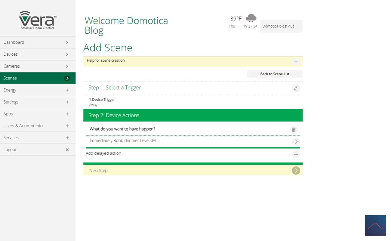 I would like the dimmer to be turned off when I am away. We use the location position which is ingrained in the Vera as a starting point. This looks at your phone's location. If this indicates that we are gone, we turn off the lamp.