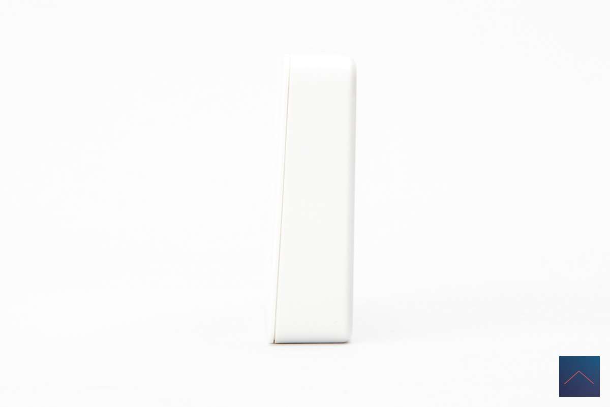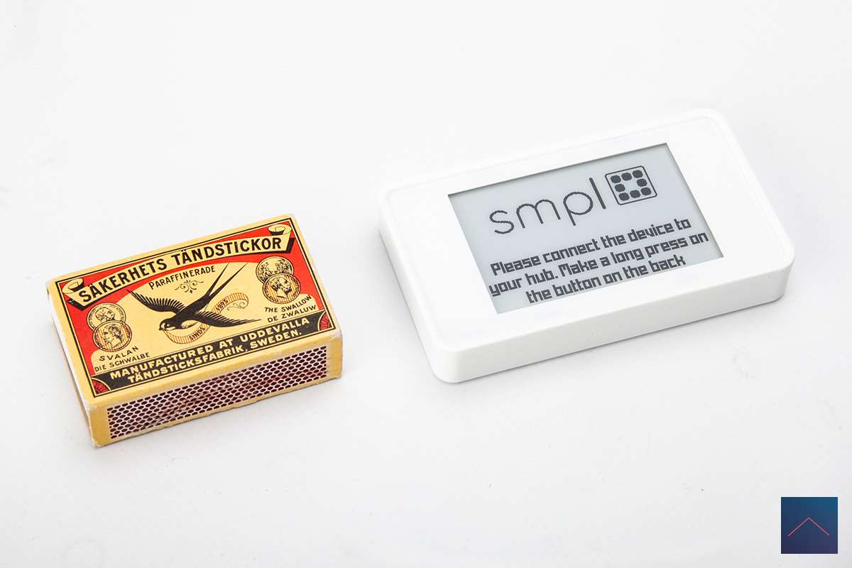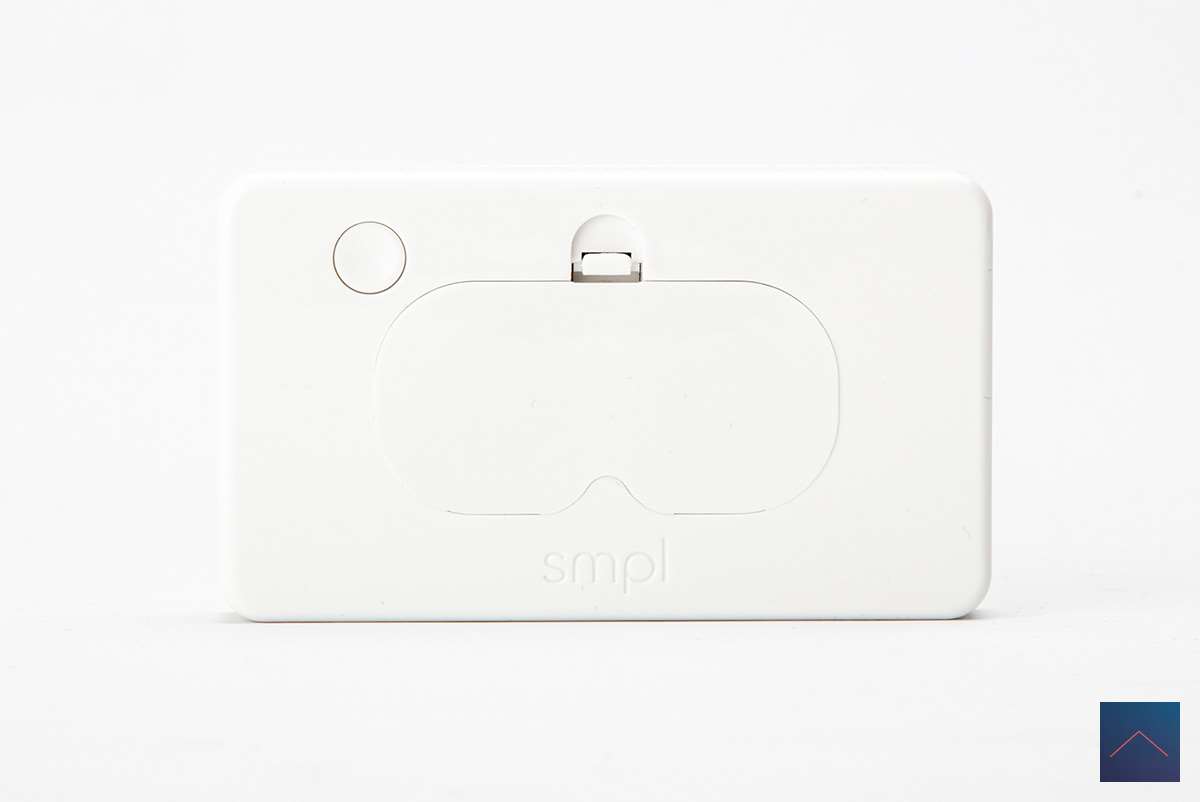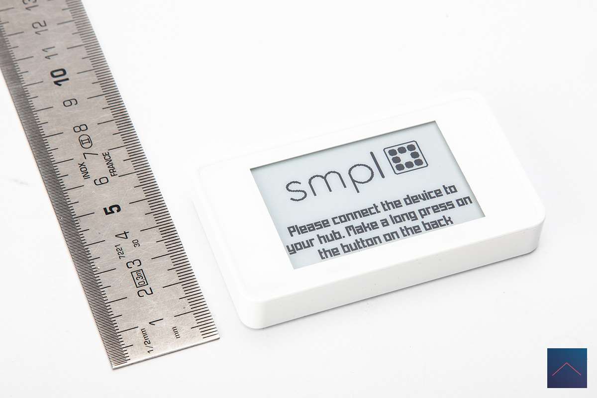The SMPL hangs from a bracket and is 86mm x 50mm and only 14mm thick. It is made of white plastic and feels sturdy.